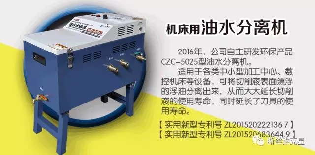 2016年,公司自主研發(fā)環(huán)保產(chǎn)品CZC-5025型油水分離機。適用于各類中小型加工中心、數(shù)控機床等設(shè)備,可將切削液表面漂浮的浮油分離出來,從而大大延長切削液的使用壽命,同時延長了刀具的使用壽命。