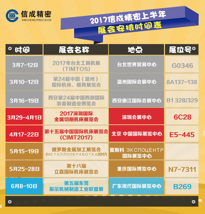 2017年上半年展會安排時(shí)間表 發(fā)布時(shí)間:2017-03-08作者:來源:洛陽信成精密機(jī)械有限公司點(diǎn)擊:6274字體【大中小】 分享到:0 用手機(jī)看 拍下二維碼,信息隨身看 試試用微信掃一掃,在你手機(jī)上繼續(xù)觀看此頁面。 上一篇:【展會】第26屆臺北國際工具機(jī)展,信成來啦! 下一篇:第十八屆立嘉國際機(jī)床展覽會