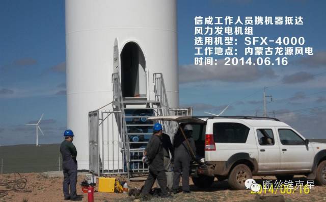 到達目的后,稍作休息。我們的技術(shù)人員便開始向現(xiàn)場的工作人員詢問斷螺栓的情況。望著巍然矗立的風力發(fā)電塔,面臨的首要困難便是把設(shè)備運送上去。穿好防護服,沿著內(nèi)部云梯登上了65米高空的塔頂,安裝好提升機,把設(shè)備運送上來。