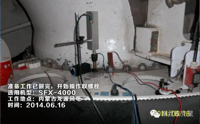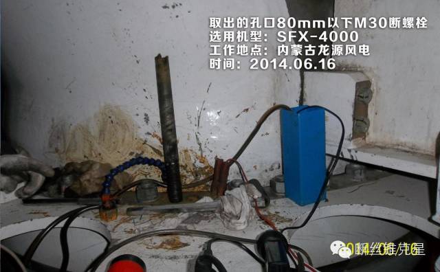 今天介紹我公司接到的一個艱巨的任務,去除一顆在風力發(fā)電設(shè)備中因意外折斷的M30深270mm的斷螺栓。因為折斷的深度太深,螺栓直徑過大,用一般的去除斷螺栓方法難以去除。我公司在接到任務后,經(jīng)過技術(shù)分析,決定派請我們的技術(shù)人員前往去除斷螺栓。
