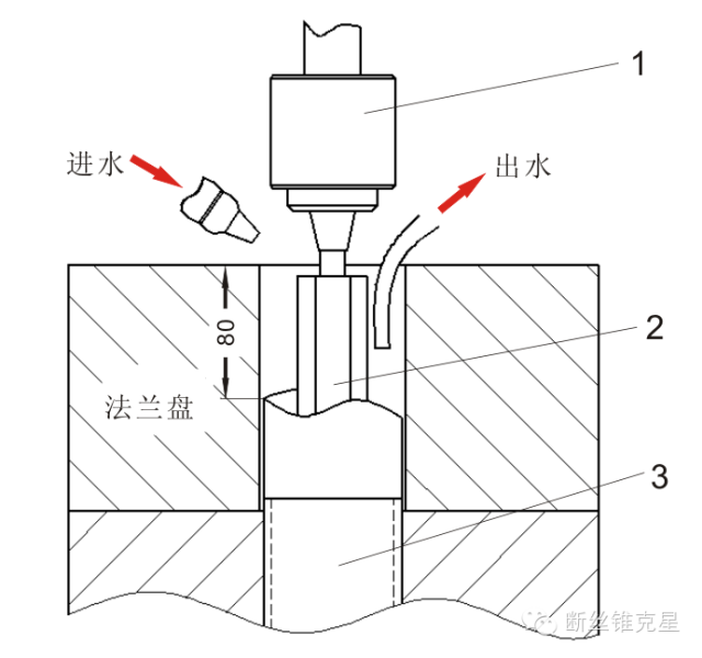 由于為高空作業(yè),且空間狹小,無法架設(shè)水槽,工作液無法連續(xù)流動,加工后產(chǎn)生的廢水不能及時排除孔內(nèi),這樣會降低加工效率。在經(jīng)過思考后劉師傅又在加工孔內(nèi)另設(shè)一個排水管,通過排水泵將廢水排出,這樣通過給水泵和排水泵的雙重工作成功解決工作液無法流動的問題,產(chǎn)生的廢水也及時排出孔內(nèi),有效提高了加工效率。