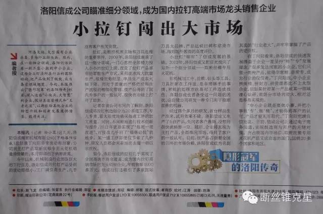 如今,洛陽信成的拉釘幾乎實現(xiàn)了全國市場全覆蓋,成為國內(nèi)拉釘市場的龍頭銷售企業(yè),年銷售額1000多萬元。信成拉釘還吸引了多家國際刀具大品牌,產(chǎn)品遠銷日韓和歐美市場,得到國外客商的高度評價。