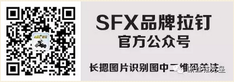 掃碼關(guān)注SFX品牌拉釘訂閱號、斷絲錐克星服務(wù)號,并把此信息轉(zhuǎn)發(fā)到朋友圈,可到E4-B11展位***取價值35元SFX品牌拉釘壹支。