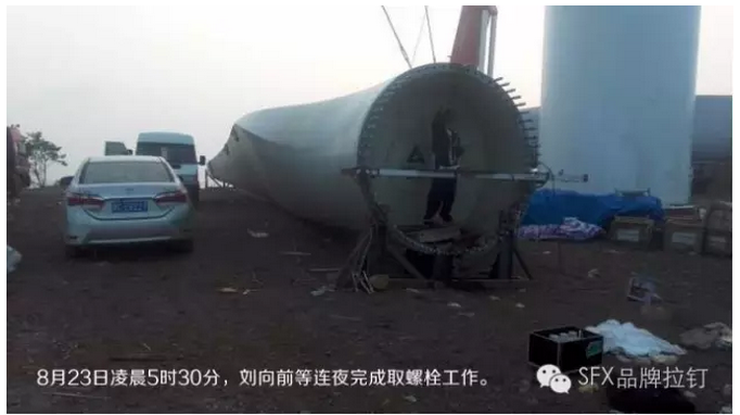 2016年8月22日上午10時,洛陽信成精密機(jī)械有限公司取斷螺栓項(xiàng)目部接到了一個緊急求助電話。電話那邊是湖北荊門的一家風(fēng)電施工企業(yè),正在安裝的風(fēng)葉上有一顆M36雙頭螺栓粘死,為了保證質(zhì)量以及風(fēng)葉安裝的安全,項(xiàng)目只得暫時停工。