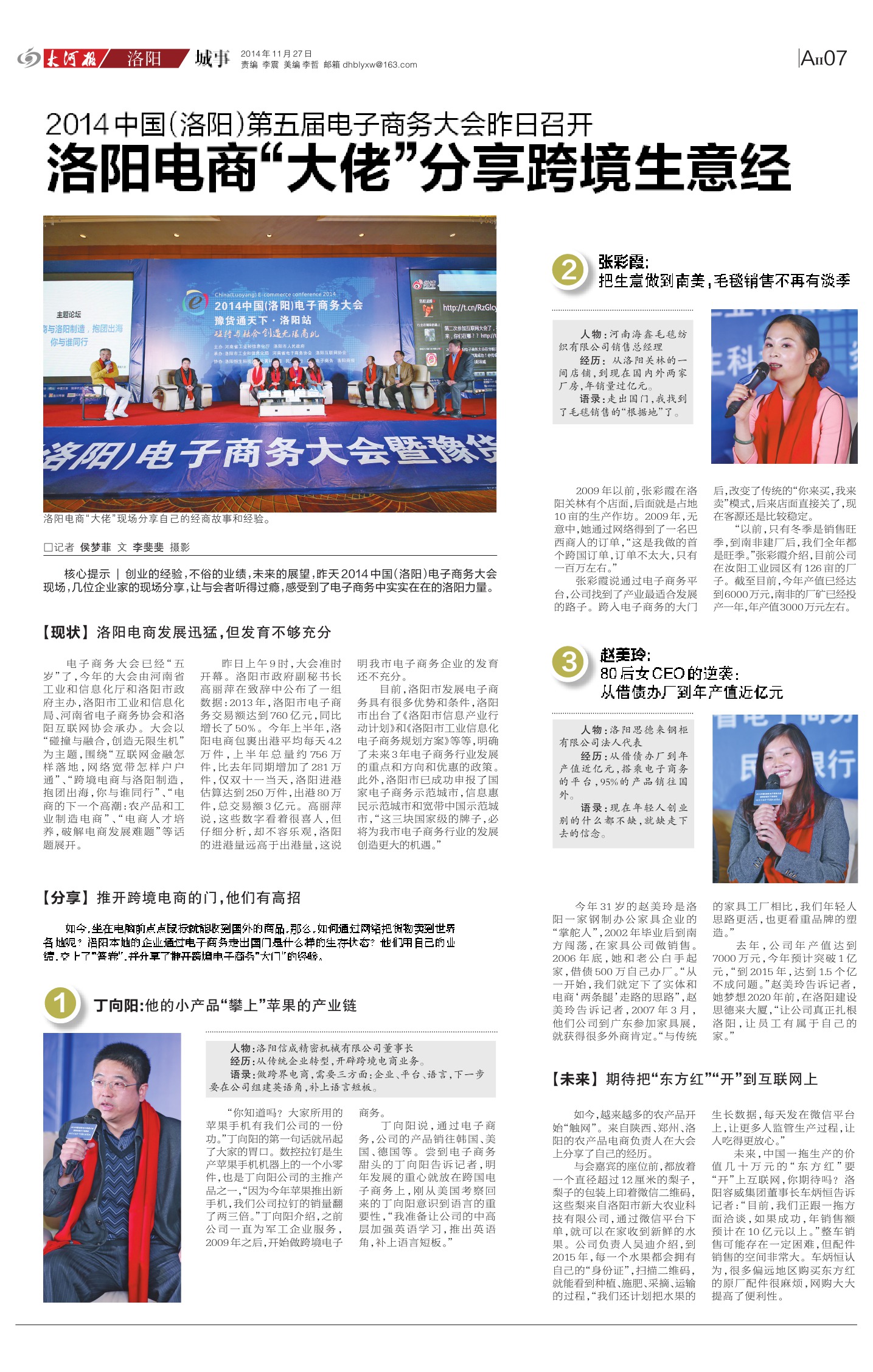 【核心提示】 創(chuàng)業(yè)的經(jīng)驗(yàn),不俗的業(yè)績(jī),未來(lái)的展望,昨天2014中國(guó) (洛陽(yáng)) 電子商務(wù)大會(huì)現(xiàn)場(chǎng), 幾位企業(yè)家的現(xiàn)場(chǎng)分享,讓與會(huì)者聽(tīng)得過(guò)癮, 感受到了電子商務(wù)中實(shí)實(shí)在在的洛陽(yáng)力量。