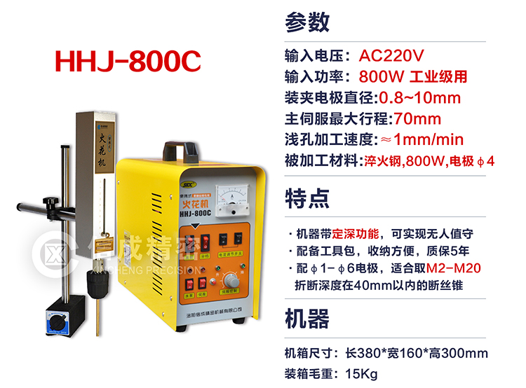 - 簡介:HHJ-800C便捷式火花機功率800W,可設(shè)定深度,盲孔取絲錐時不需人工看守,自動返回并報警,而且有單獨的工具包方便收納。