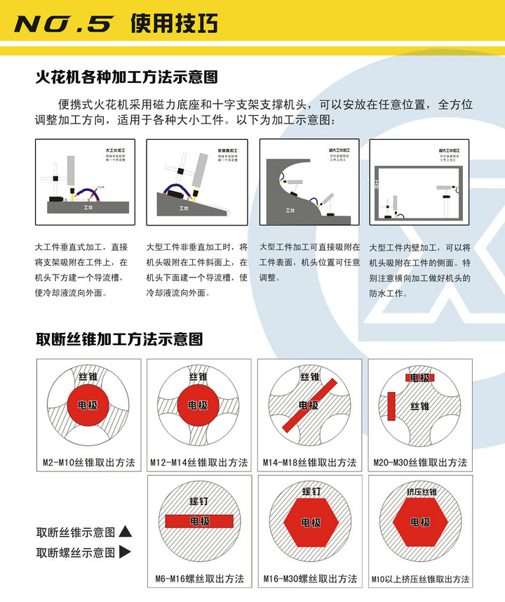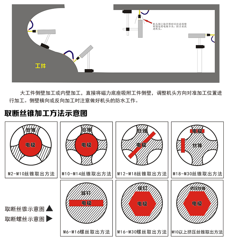 配M1-M6電極,適合取M2-M20,折斷深度在40mm以內(nèi)的斷絲錐,特別是在取M10以上斷絲錐時效果明顯增快